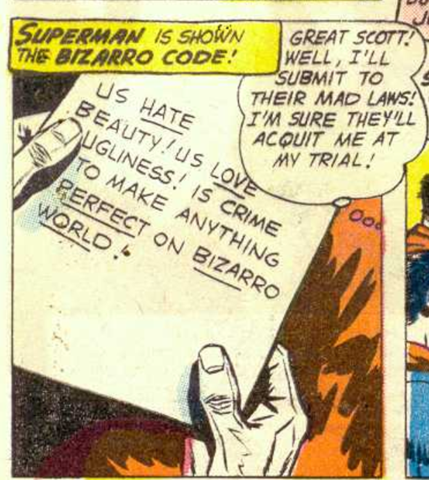 El Bizarre Code dice: “¡Hacemos lo contrario de todas las cosas terrenales! ¡Odiamos la belleza! ¡Nos encanta la fealdad! ¡Es un gran crimen hacer algo perfecto en el Mundo Bizarro!”